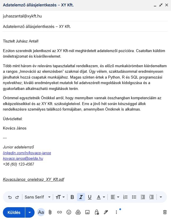 - Csatolmányok: Az e-mailhez csatold az egymással harmonizáló önéletrajzodat és kísérőleveledet.