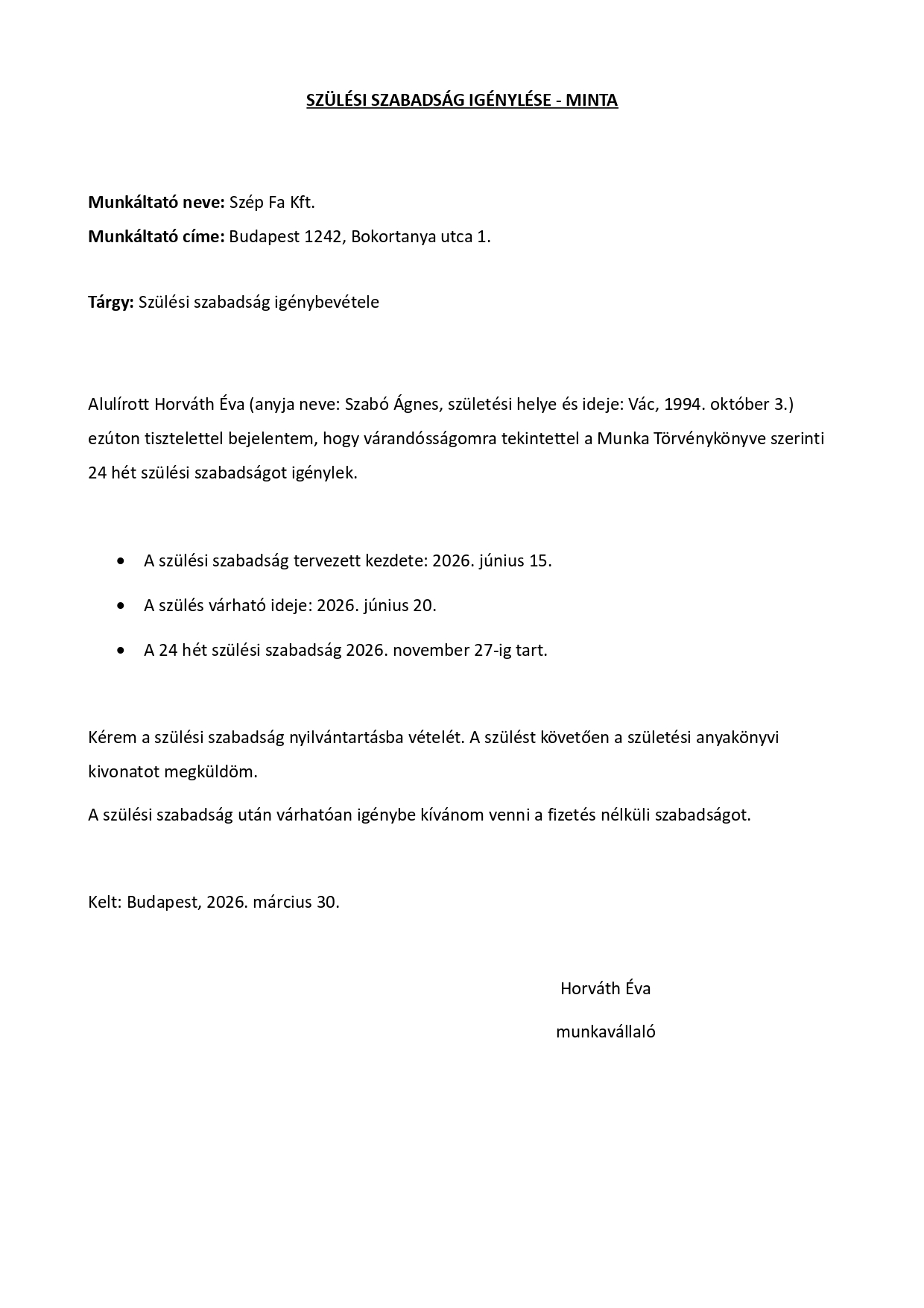 Szülési szabadságra vonatkozó értesítés - példa