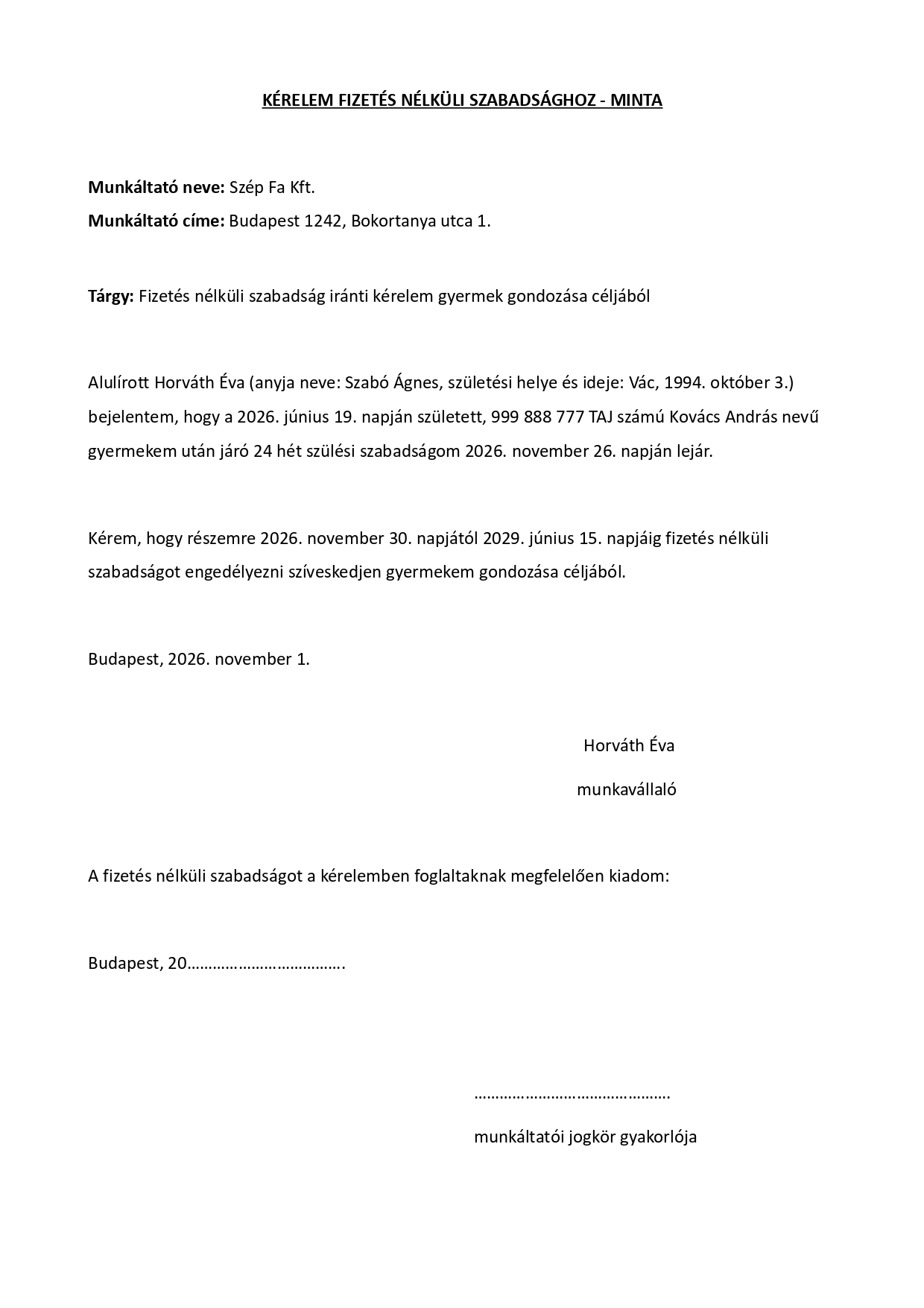 Szülési szabadságot követő fizetés nélküli szabadság iránti kérelem - példa