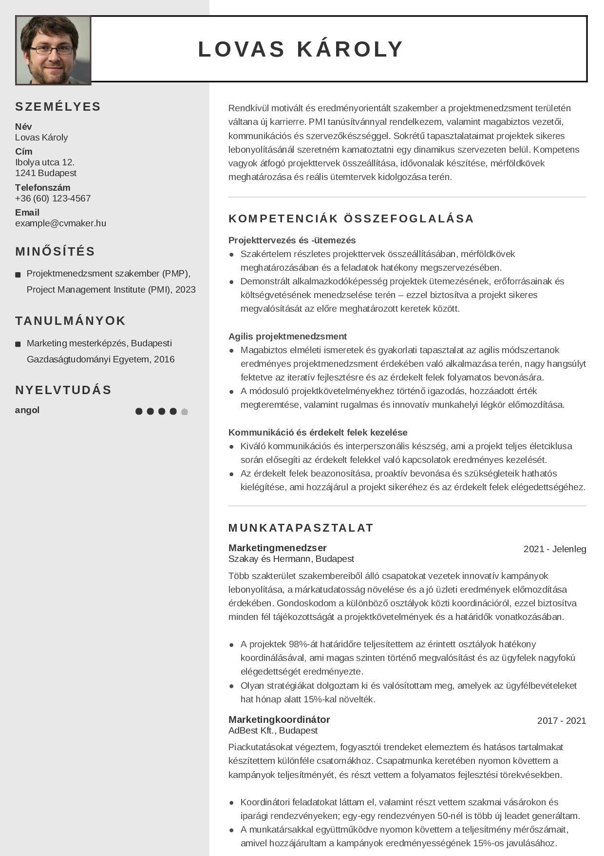 Károly marketingmenedzser, aki a projektmenedzsment területére szeretne átnyergelni. Kompetenciáinak összegzése meggyőzően emeli ki azokat a főbb készségeit és eredményeit, amelyeket az új szerepkörében hasznosítani tud majd. A tanulmányait és a minősítéseit bemutató rész is igazolja, hogy folyamatosan képes új kompetenciákat elsajátítani. Kiváló vezetőként állítja magát az önéletrajz olvasója elé, aki a folyamatokat többek közt új ötletek gyakorlatba ültetésével és szoftverek használatával teszi hatékonyabbá.